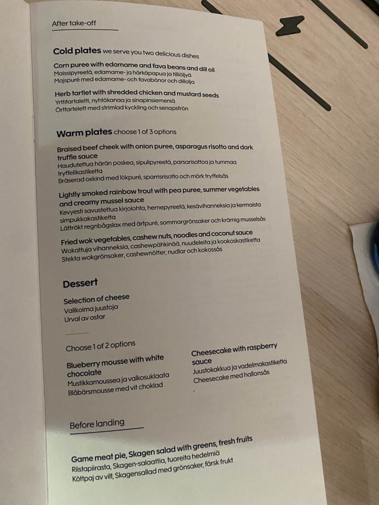 Auf dem Flug nach Singapur gibt es zwei Essens-Services. Das Dinner direkt nach dem Start, und einen Frühstücksservice ab etwa drei Stunden vor der Landung. Die angebotenen Speisen können vorab online eingesehen werden und innerhalb der Buchung auch die Wunschoption für den Hauptgang vorbestellt werden. Die Business Class Speise- und Getränkekarte für unseren Flug AY131 von Helsinki nach Singapore konnten wir hier einsehen.