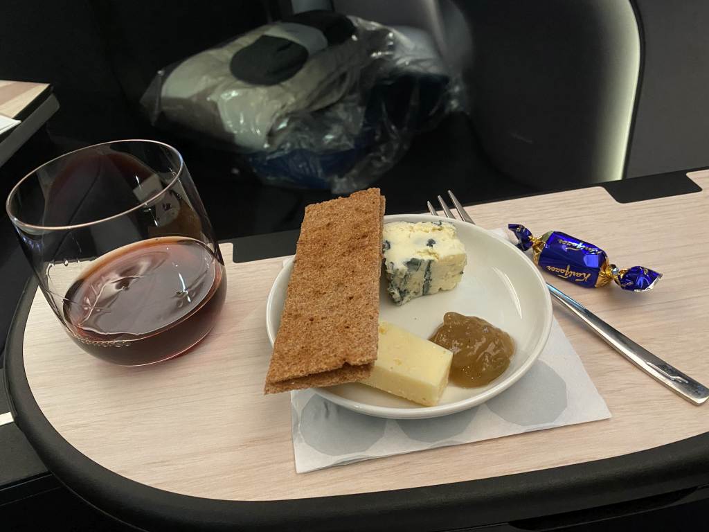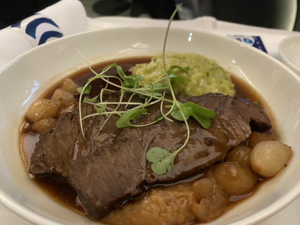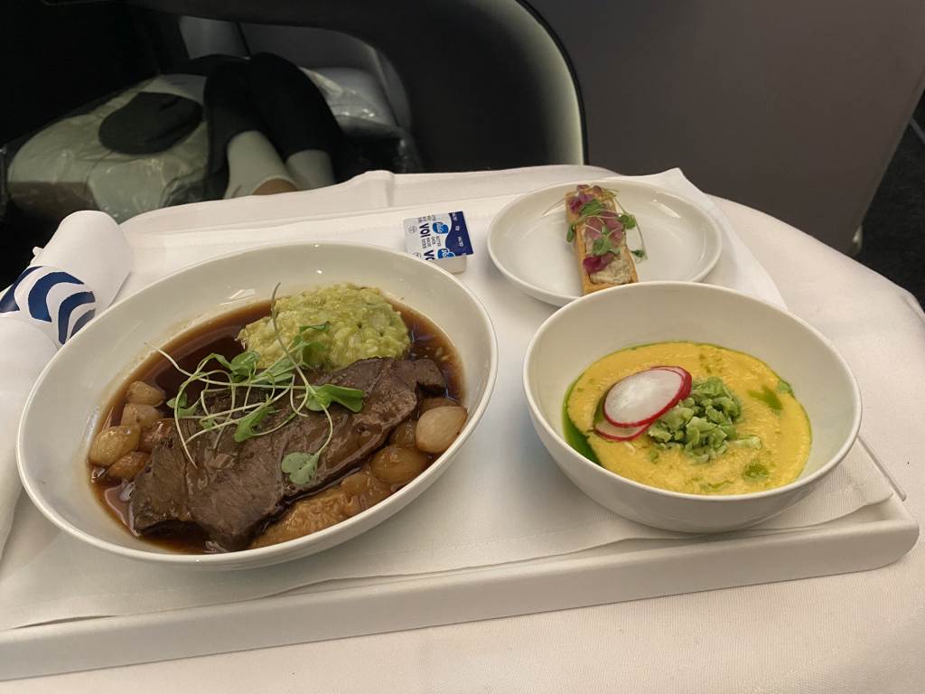 Leider stellte sich hier heraus, dass das gesamte Konzept noch nicht eingespielt ist. Wir hatten die geschmorten Rinderbäckchen online vorbestellt. An Bord wurden wir so ziemlich zuletzt nach unseren Wünschen für den Hauptgang gefragt. Mit dem Hinweis, dass das Rind nur noch einmal verfügbar wäre. Auf meinen Hinweis, dass wir genau das im Vorfeld vorbestellt hatten, wurde uns geantwortet, dass man keine Menüwünsche für diesen Flug in der Business Class verzeichnet hätte. Die Bitte, dass wir die Bestätigung heraussuchen, war mir dann etwas unangenehm.