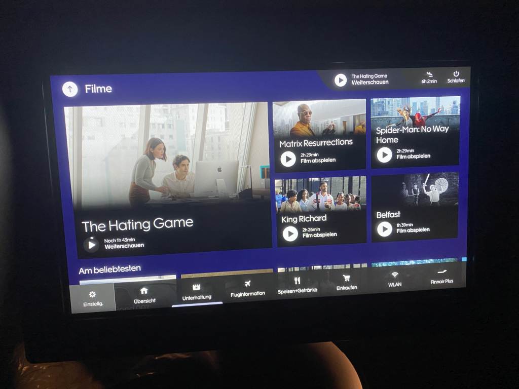 Bei fast 13 Stunden Flugzeit ist ein gutes Entertainment-System schon Pflicht. Die Auswahl bei Finnair empfinde ich im Vergleich zu anderen Airlines weiterhin überschaubar. Zwar bietet das IFE auch eine Auswahl absolut aktueller Blockbuster, wie dem Bond-Streifen „Keine Zeit zu Sterben“, aber man ist mit dem Programm auch schnell durch. Ich weiß nicht, wie oft ich den Damen „Pets 2“ neu gestartet habe.