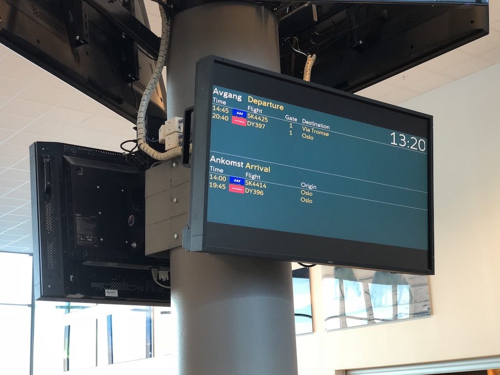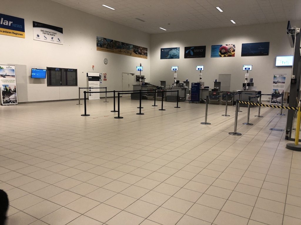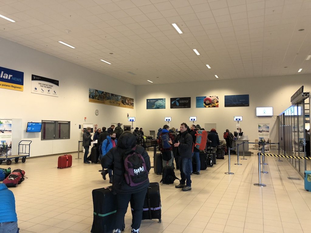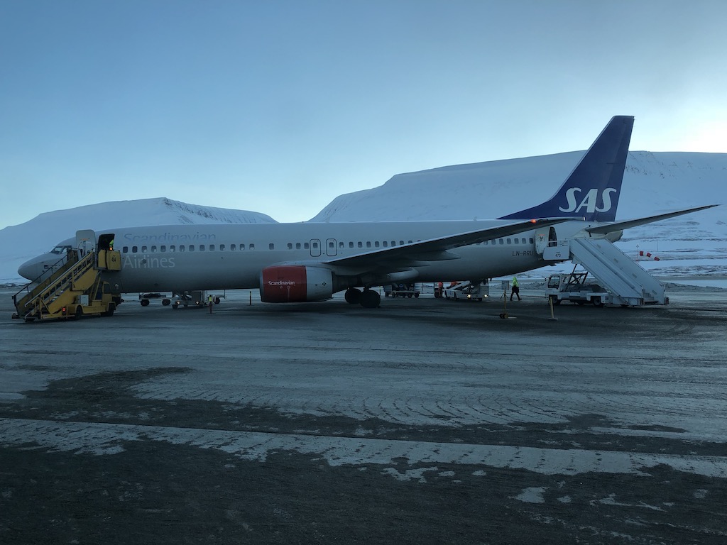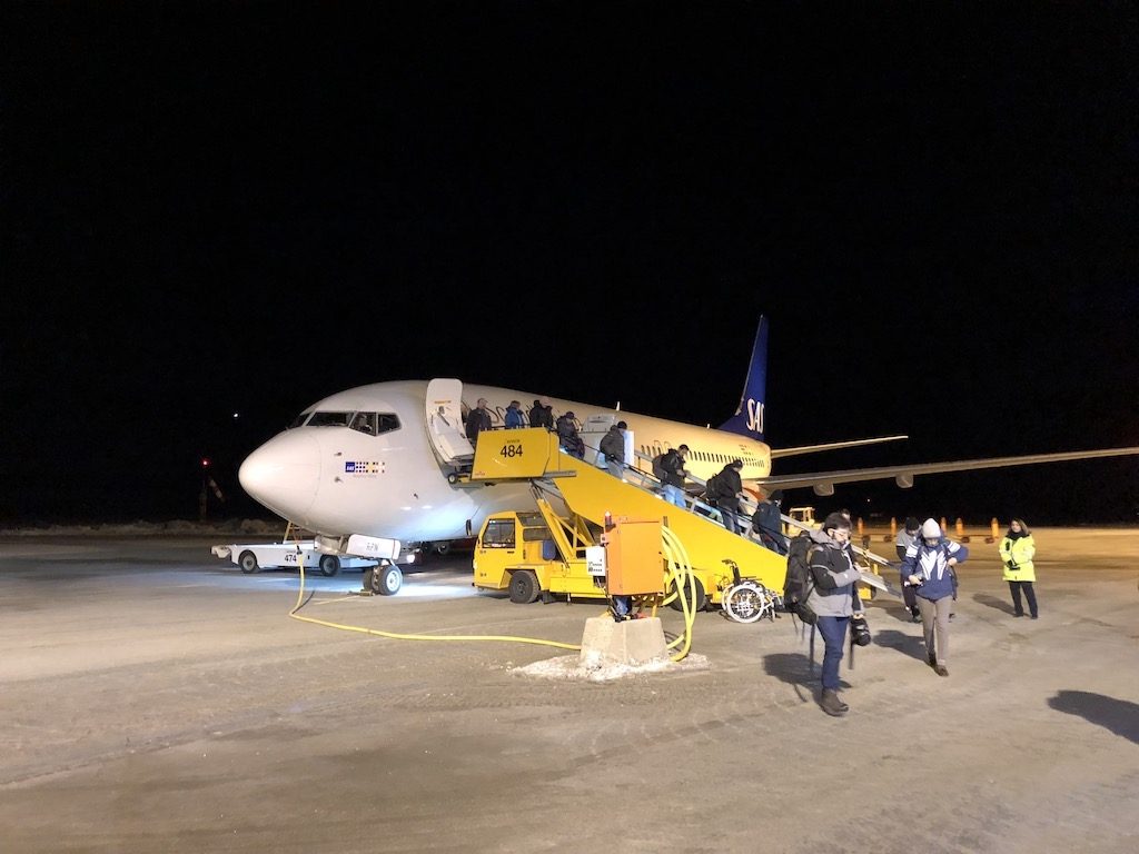 Mit leichter Verspätung setzten wir mit Flug SK4494 in völliger Dunkelheit gegen 20:00 Uhr auf der einzigen Landebahn (10/28, 2.480 m) des Flugplatzes auf, welcher zwischen schneebedeckten Bergen und zugefrorenen Fjorden eingepfercht ist. Kurz vor dem Terminal kam unsere Boeing 737-800 zum Stehen – eine echte Parkposition, Gates oder vergleichbare übliche Dinge größerer Flughäfen gibt es hier nicht. Nach wenigen Momenten öffneten sich bereits die Türen und über die Treppen verließen wir das Flugzeug in die eiskalte arktische Nacht. Der Wind ähnelte einem Schlag ins Gesicht und wir eilten schnellstmöglich mit den übrigen Passagieren über das vollkommen vereiste Vorfeld in ein kleines spärlich beleuchtetes Gebäude, welches sich als Terminal herausstellte.