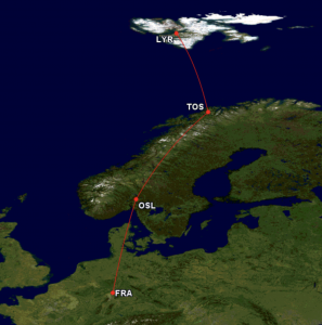 Wie bereits im Review über die SAS Café Lounge in Tromsø berichtet, flogen wir mit SAS von Frankfurt via Oslo und Tromsø nach Longyearbyen [LYR]. Dieser Flughafen ist in jedem einzelnen Aspekt besonders und dürfte eine der großen Trophäen für Flughafensammler darstellen – denn immerhin ist es der nördlichste Flughafen mit Linienbetrieb weltweit – auf dem 78. Breitengrad, rund 1300 Kilometer vom Nordpol entfernt, inmitten der Arktis!