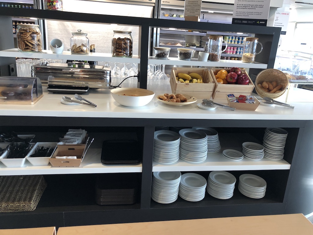 In der Lounge gibt es zahlreiche Kühlschränke die sonst zur Selbstbedienung bereit stehen. Derzeit waren diese gesperrt und wurden lediglich vom Personal als Vorrat genutzt. Die Ausgabe der meisten Speisen und Getränken erfolgt durch die Mitarbeiter, lediglich der Vollautomat für Kaffee und Tee nutzen die Besucher selbstständig.