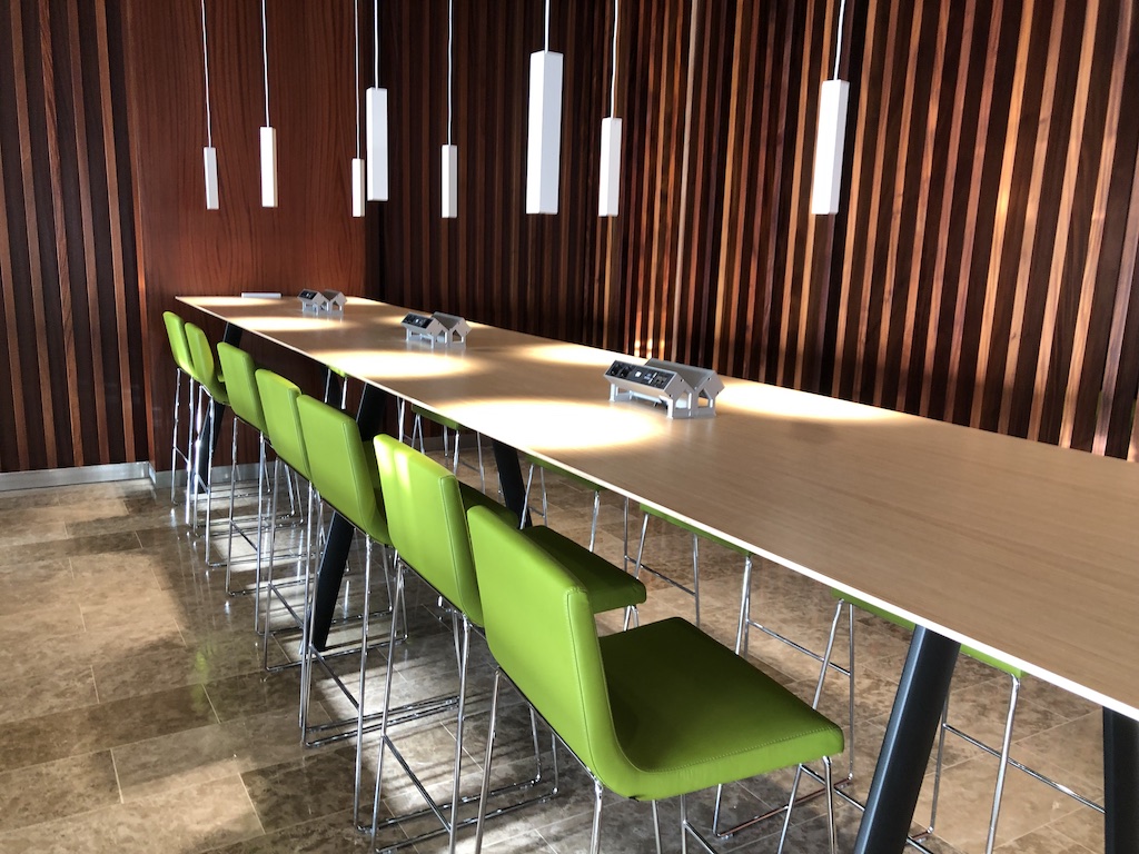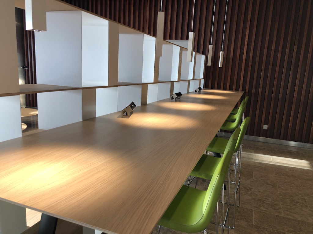 Es stehen zahlreiche Sitzmöglichkeiten zur Verfügung, darunter mehrere Arbeitsplätze für Laptops mit Stromanschlüssen.