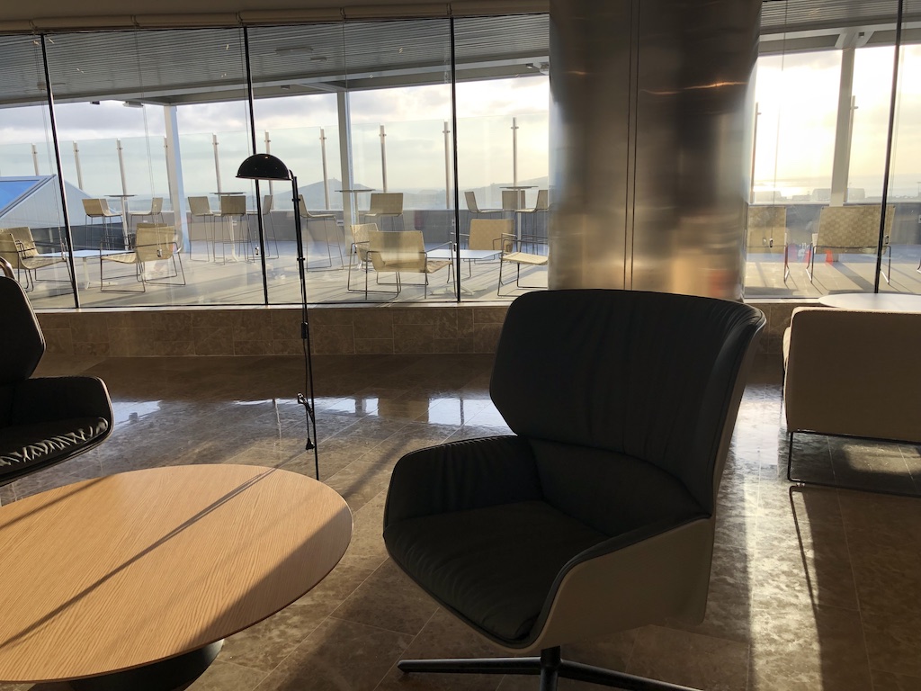 Die Lounge ist durch die großen Panoramafenster sehr hell und erlaubt einen schönen Blick auf die Flugzeuge.