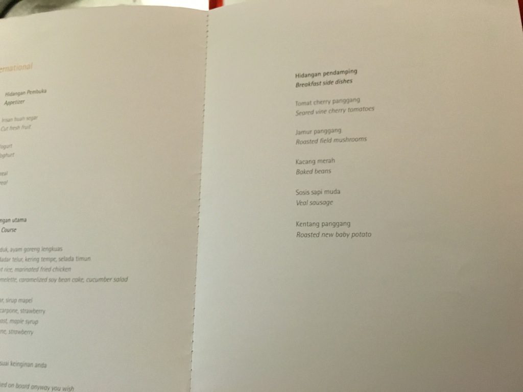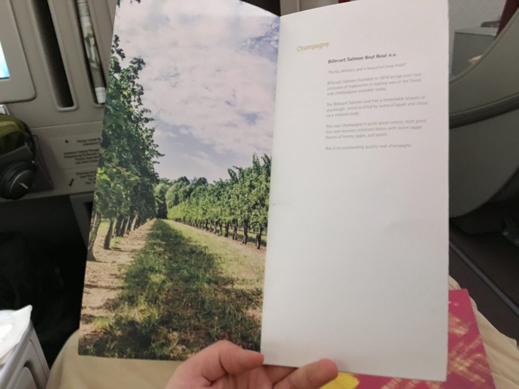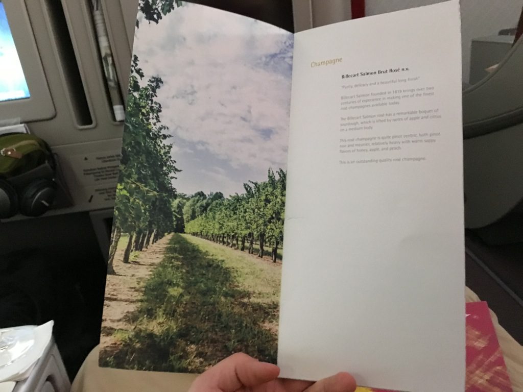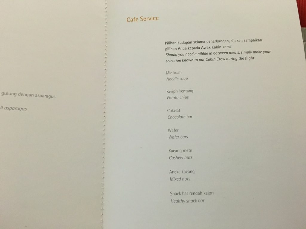 Es wurden Menükarten verteilt und noch vor dem Start abgefragt, was man Essen und Trinken wolle und ob man zum Frühstück geweckt werden wolle. Dabei wurde bei diesem späten Abflug kein volles Abendessen mehr serviert, vielmehr gab es ein Snack Menü, aus welchem man sich noch einige Speisen aussuchen konnte.