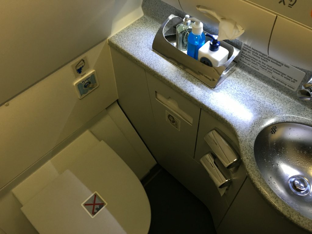Noch vor dem Start habe ich im Bad meinen selbst mitgebrachten Pyjama angezogen. Neben dem sehr umfangreichen Garuda Amenity Kit, gab es auf den Toiletten auch noch Handcreme und Parfüm für die Gäste.