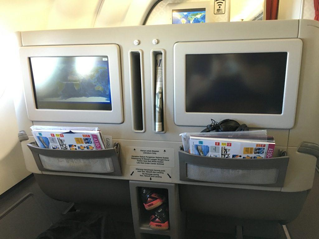 Sehr positiv natürlich immer die Steckdosen an jedem Platz. Für die Kopfhörer gab es einen gut positionierten Anschluss über der Armlehne. Auch einen USB Anschluss, an welchen man noch ein weiteres Gerät laden kann gab es. Übrigens verfügte dieser Garuda Indonesia Airbus A330 auch über in flight WIFI. Allerdings habe ich es nichts genutzt und kann daher nichts über die Geschwindigkeit sagen.