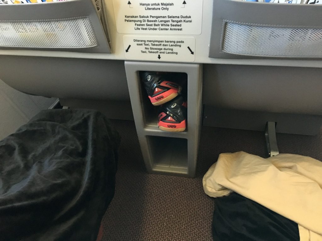 Da dieser Sitz allerdings nicht wirklich als full flat seat entwickelt wurde, ist er beim Schlafen leider nur bedingt bequem. Wenn er komplett flach gestellt ist, bildet sich leider ein Spalt innerhalb der Liegefläche, was recht unangenehm war. Garuda scheint dieses Problem allerdings erkannt zu haben und baut nach und nach neue Business Class Sitze in ihre Airbus A330 ein. Diese sind dem neuem Air France Business Class Sitz recht ähnlich.
