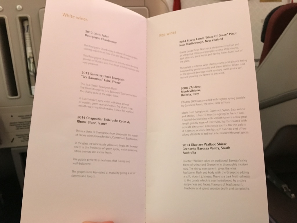 Es wurden Menükarten verteilt und noch vor dem Start abgefragt, was man Essen und Trinken wolle und ob man zum Frühstück geweckt werden wolle. Dabei wurde bei diesem späten Abflug kein volles Abendessen mehr serviert, vielmehr gab es ein Snack Menü, aus welchem man sich noch einige Speisen aussuchen konnte.