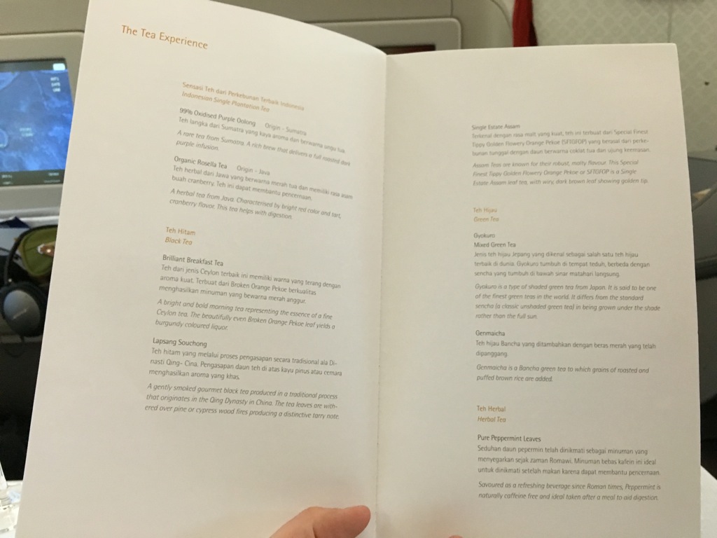 Sehr positiv natürlich immer die Steckdosen an jedem Platz. Für die Kopfhörer gab es einen gut positionierten Anschluss über der Armlehne. Auch einen USB Anschluss, an welchen man noch ein weiteres Gerät laden kann gab es. Übrigens verfügte dieser Garuda Indonesia Airbus A330 auch über in flight WIFI. Allerdings habe ich es nichts genutzt und kann daher nichts über die Geschwindigkeit sagen.