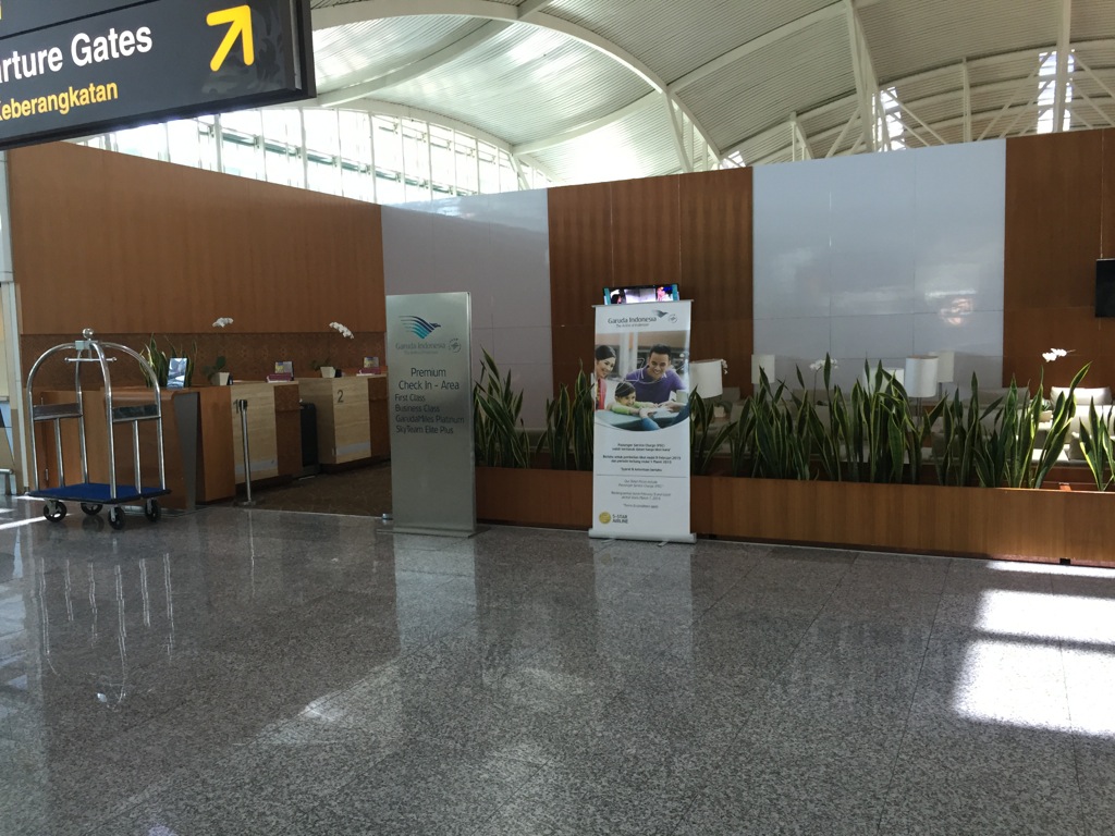 Garuda betreibt in Bali eine eigene kleine Check- In Lounge für First- und Business Class Passagiere, sowie Passagiere mit Sky Team Status. Dabei besteht diese Check- In Lounge nur aus einigen Sitzgruppen mit Sesseln und den Check-In Schaltern. Wartezeit gibt es an diesen Schaltern aber wohl so gut wie nie.