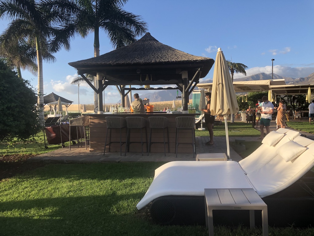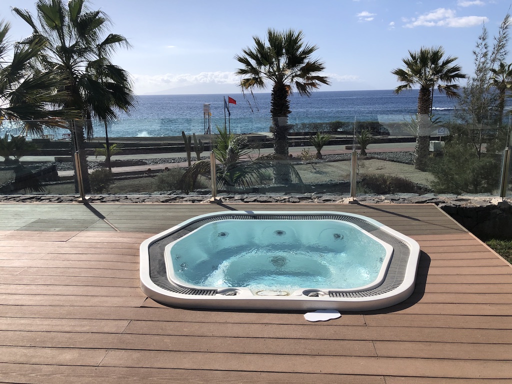 Direkt am Strand gibt es weitere Liegen und eine Bar. Aus dem unbeheizten Jacuzzi hatte man direkten Blick auf das Meer und den Sonnenuntergang. Dort ist auch die Bar für die Cocktails, die täglich zwischen 17 und 18 Uhr frei ausgeschenkt werden.