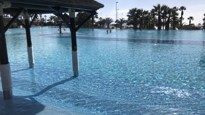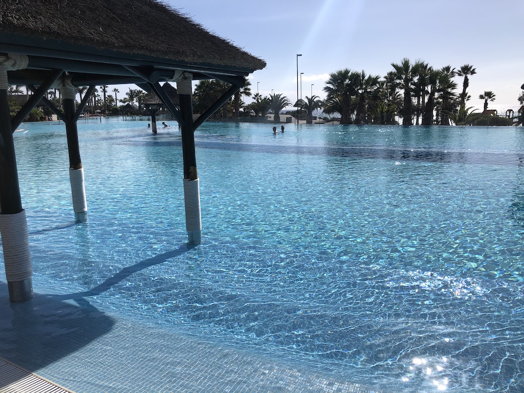 Es gibt einen riesigen Pool mit unterschiedlichen Bereichen, Bars und Restaurants. Die Anlage ist sehr grün und lässt viel Arbeit für die Instandhaltung vermuten.