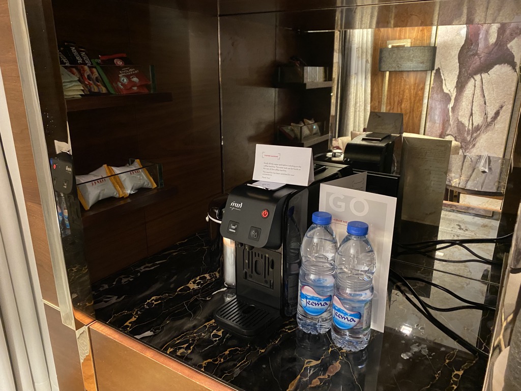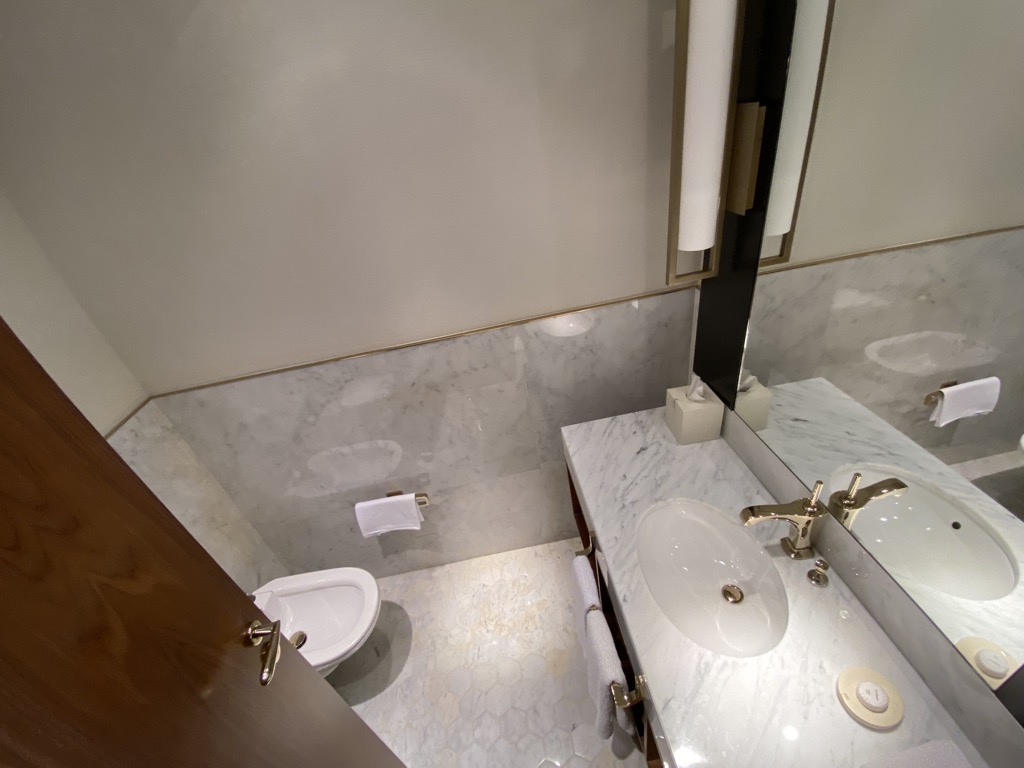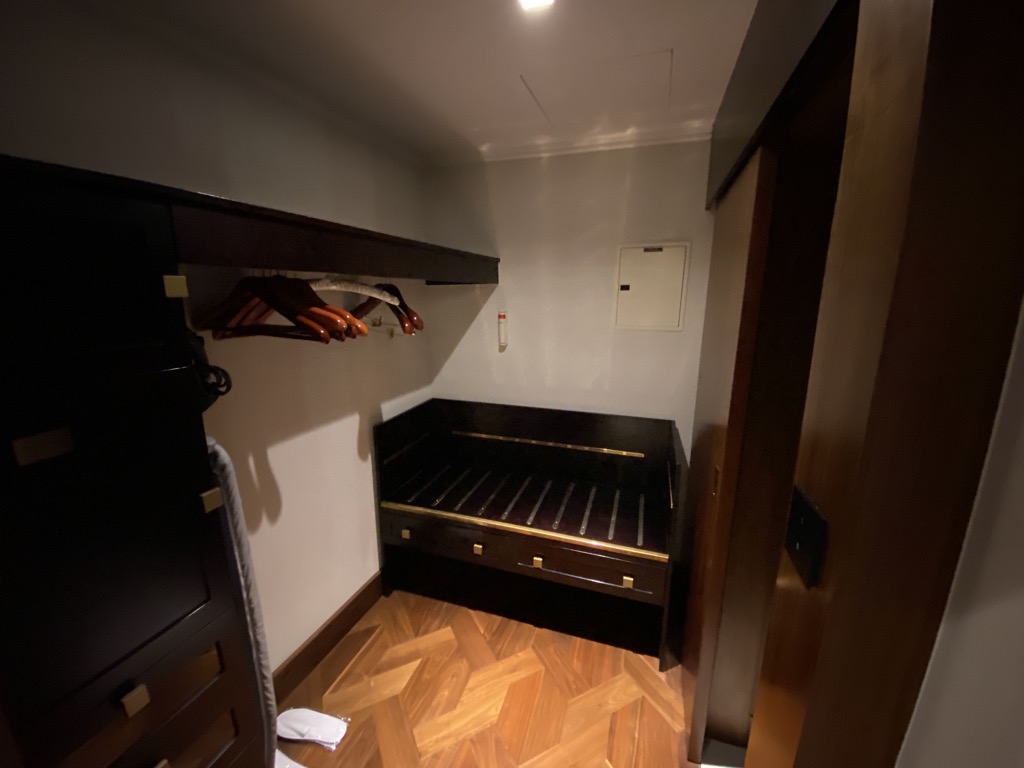 Durch eine Verbindungstür gelangte man ins großzügige Schlafzimmer, in dem neben dem großen Bett auch nochmal eine Couch untergebracht war. Besonders positiv sind uns die Steckdosen an den Nachttischen aufgefallen, an denen man seine elektrischen Geräte laden konnte. Im Schlafbereich ist auch ein kleiner Schrank untergebracht, in dem eine Minibar verbaut ist – auch die Kaffeemaschine befindet sich hier. Auf dem Weg ins Badezimmer geht man durch einen begehbaren Kleiderschrank, in dem unter anderem auch ein Bügelbrett bereit stand.