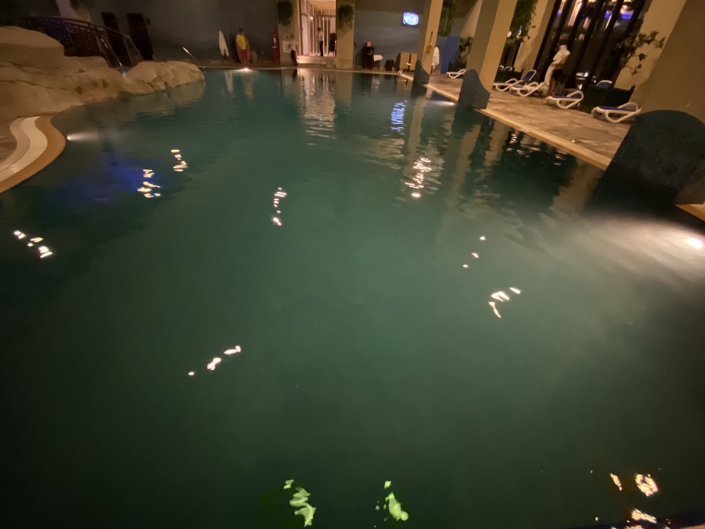 Am Abend haben wir noch den Innenpool besucht, bei dem auch ein Whirlpool dabei ist. Hier dürfen theoretisch ab einer bestimmten Uhrzeit keine Kinder mehr schwimmen – darauf geachtet wurde trotz Lifeguard nicht. Mit der Situation am Außenpool war es keineswegs zu vergleichen, daher kein Problem. Hier liegt man vor allem am Abend sehr ruhig – den Whirlpool hatten wir immer für uns alleine und das Becken lädt zu richtigem Schwimmen ein. Eine Möglichkeit, die wir im Außenpool aufgrund der Menschenmenge nicht hatten.
