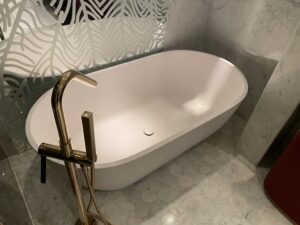 Das Badezimmer war wirklich hübsch und praktisch. Doppelwaschtische mit viel Ablagefläche sind immer klasse und die freistehende Badewanne war ein Hingucker! Auch der separate Schminktisch mit Fön hat super ins Bild gepasst. Die Dusche war groß und begehbar.