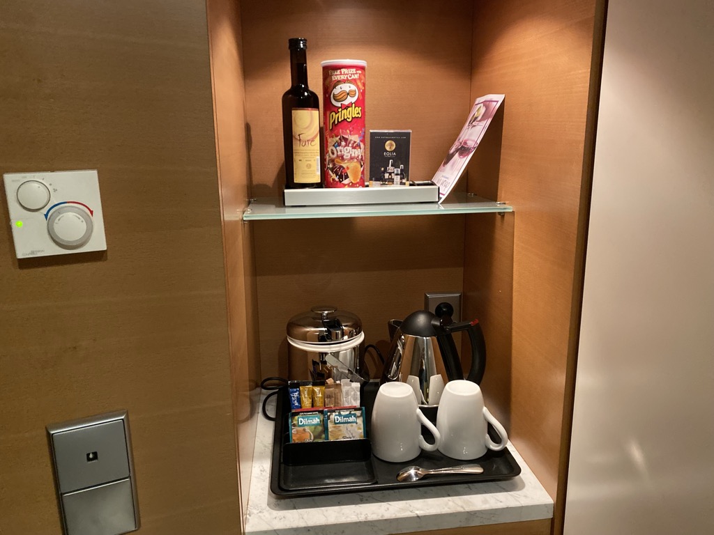 Gegenüber vom Badezimmer ist der Einbauschrank verbaut, in dem natürlich auch ein Safe zu finden war. Zentrales Element des Zimmer war das Bett mit durchgängiger Bettdecke. Hier haben wir sehr gut geschlafen. Hinter den Nachttischen waren Steckdosen verbaut, an denen wir unsere elektronischen Geräte laden konnten.