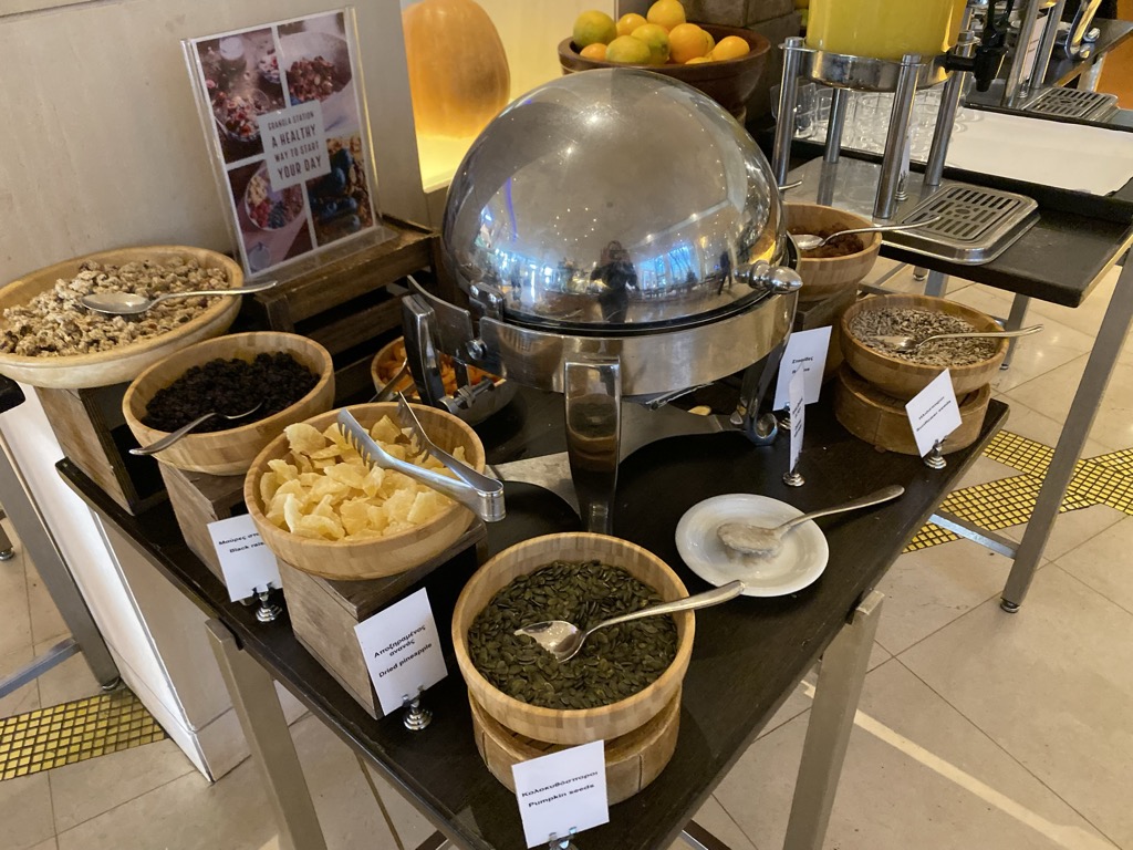 An einem großen Buffet gab es zudem Obst, Aufschnitt, Salat, verschiedene Backwaren, Müsli und Joghurt. Auch einen extra Tisch mit glutunfreien Speisen gab es hier.