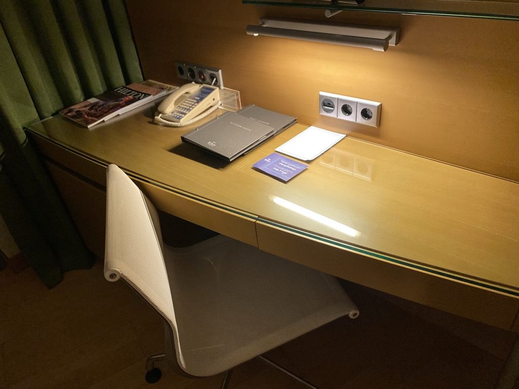 Gegenüber des Bettes stand ein Schreibtisch, über dem der Fernseher verbaut war. Hier waren auch mehrere Steckdosen in der Wand verbaut.