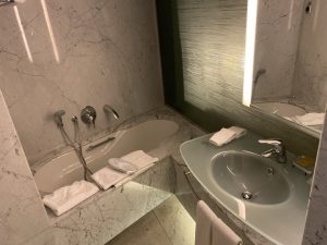 Nach dem Betreten kommt man auf der linken Seite in das Badezimmer, welches mit einer Dusche, einer Badewanne, einem WC und einem Waschbecken mit ausreichend Ablagefläche ausgestattet war. Hier begrüßten uns direkt die Hilton üblichen Amenities.