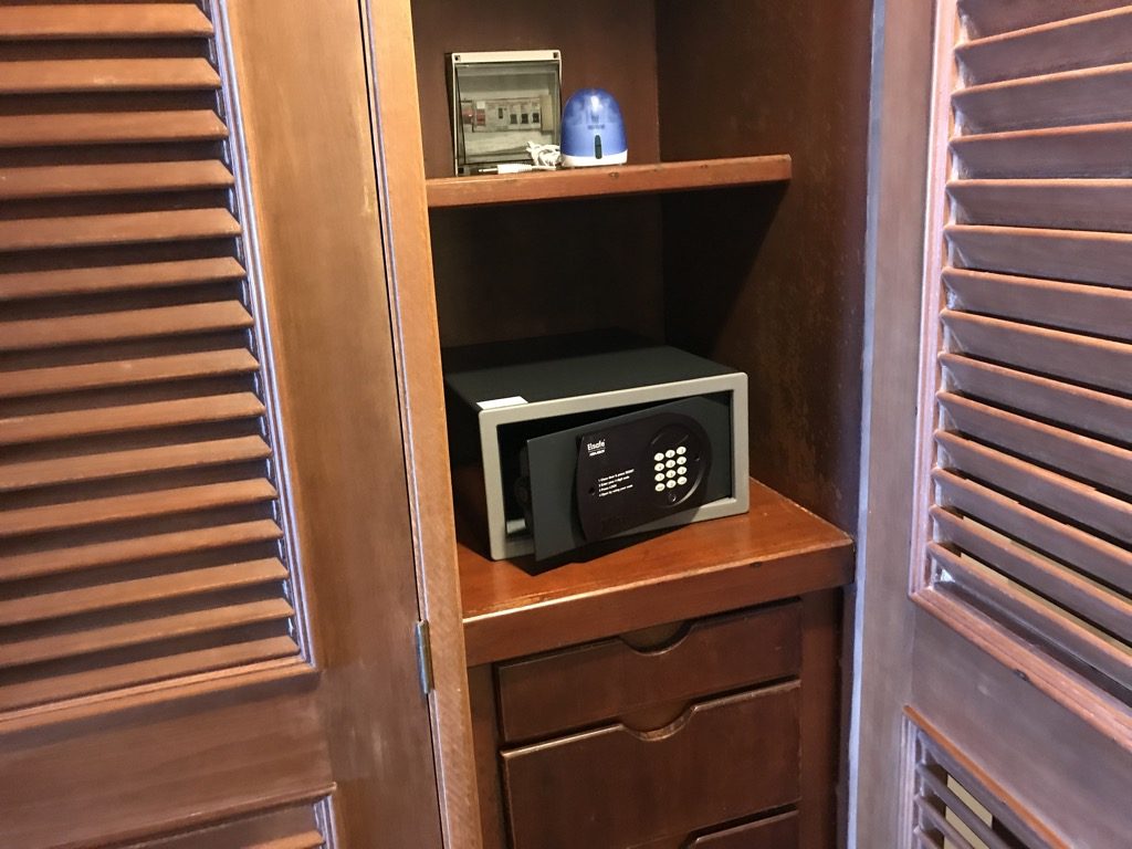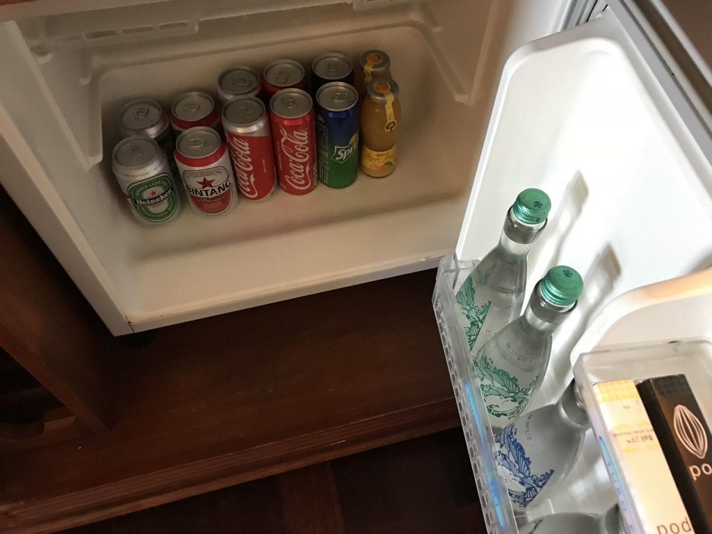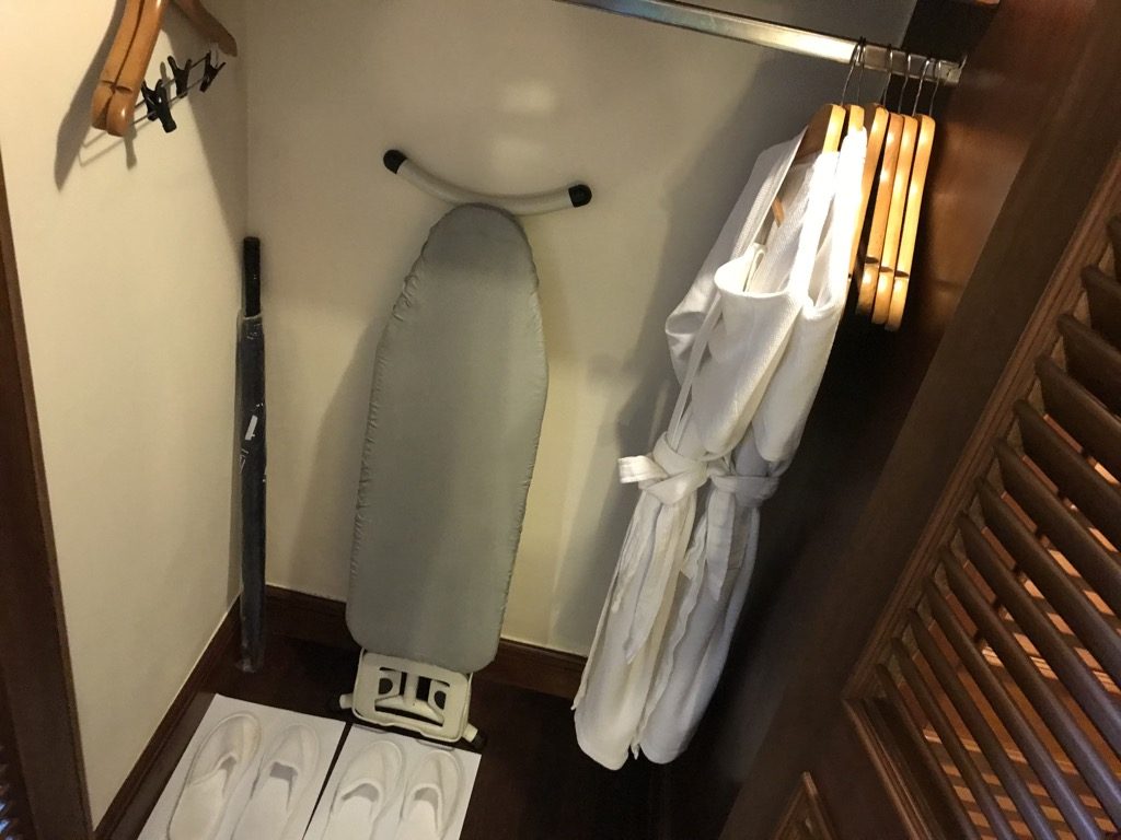 Nach dem Betreten des Zimmers befand sich auf der rechten Seite der Schrank inkl. Slipper, Regenschirm, Bademäntel und Safe. Direkt dahinter befand sich die Teestation, auf der auch frisches Wasser zu finden war. Unter der Teestation war die gefüllte Minibar.
