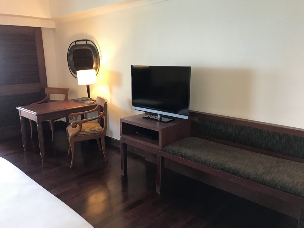Neben der Teestation befand sich eine mit Stoff bezogene Bank, welche in unserem Fall als Kofferständer diente. Direkt dahinter befanden sich noch der Fernseher und der Schreibtisch mit zwei Stühlen.