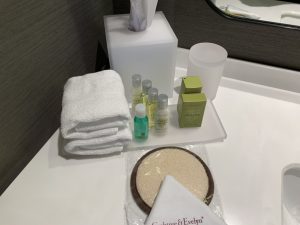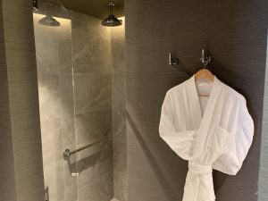 Das Badezimmer befand sich direkt neben dem Schlafbereich und verfügte über eine große Regenwalddusche und eine abgetrennte Toilette. Auf dem Waschtisch standen natürlich auch die Hilton typischen Amenities bereit.