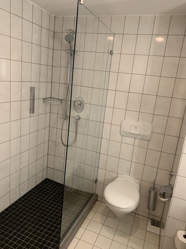 Das Bad war überschaubar, eine Badewanne gab es nicht. Dafür allerdings eine bodentiefe Dusche.