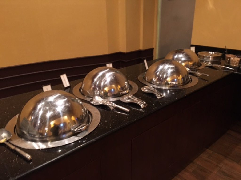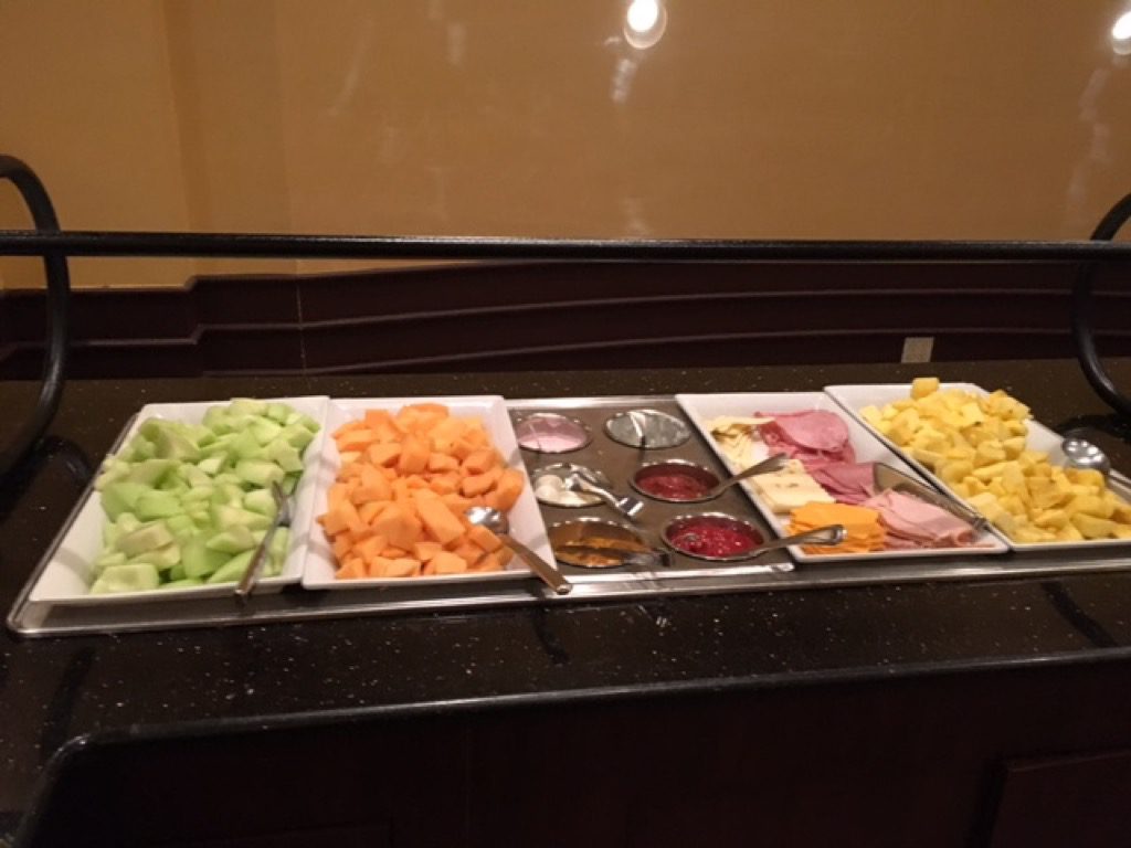 Auf dem Buffet gab es als warme Option die folgenden: Rühreier, Würstchen, Speck, Kartoffeln, Cheese Grits sowie Oatmeal. An kalten Optionen gab es eine Auswahl an Obst, Wurst, Käse und Jogurt. Auch einige Süße Teilchen, Toast und Bagel standen auf dem Buffet bereit.