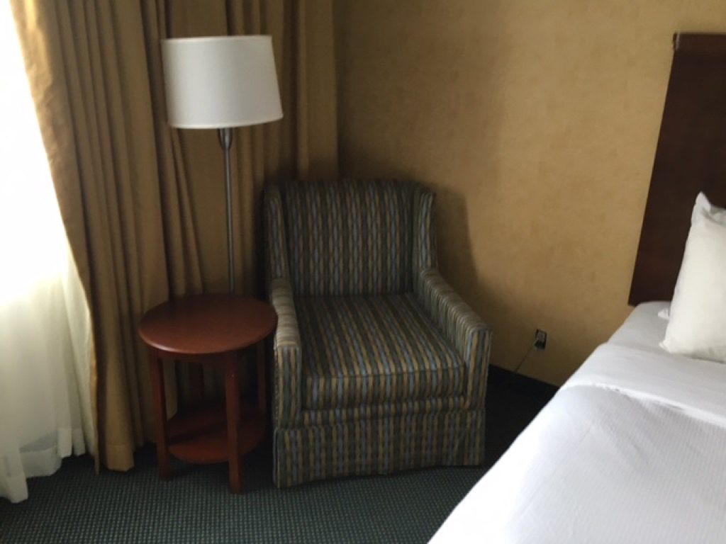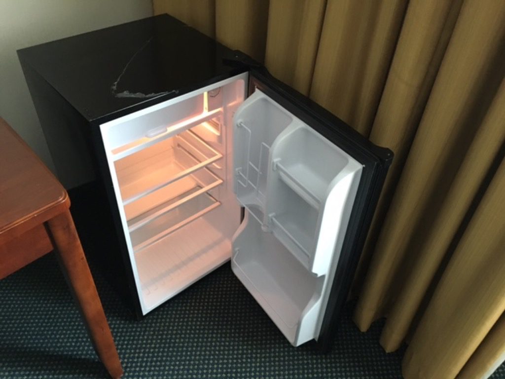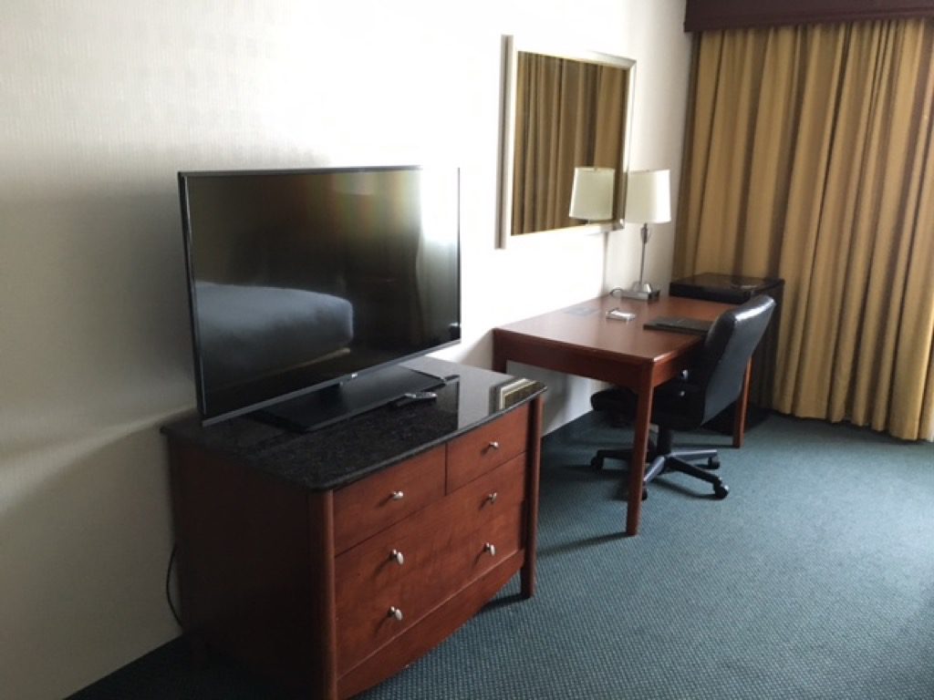 Natürlich gab es auch einen Schreibtisch und einen Fernseher mit den in den USA gängigen Pay- TV Kanälen. Auch wenn man bei Hilton inzwischen immer öfter auf eine Minibar im Zimmer verzichtet, gab es in den Zimmern des Hilton Cincinnati Airport einen Kühlschrank. Dieser war leer und zur Benutzung durch den Gast vorgesehen.