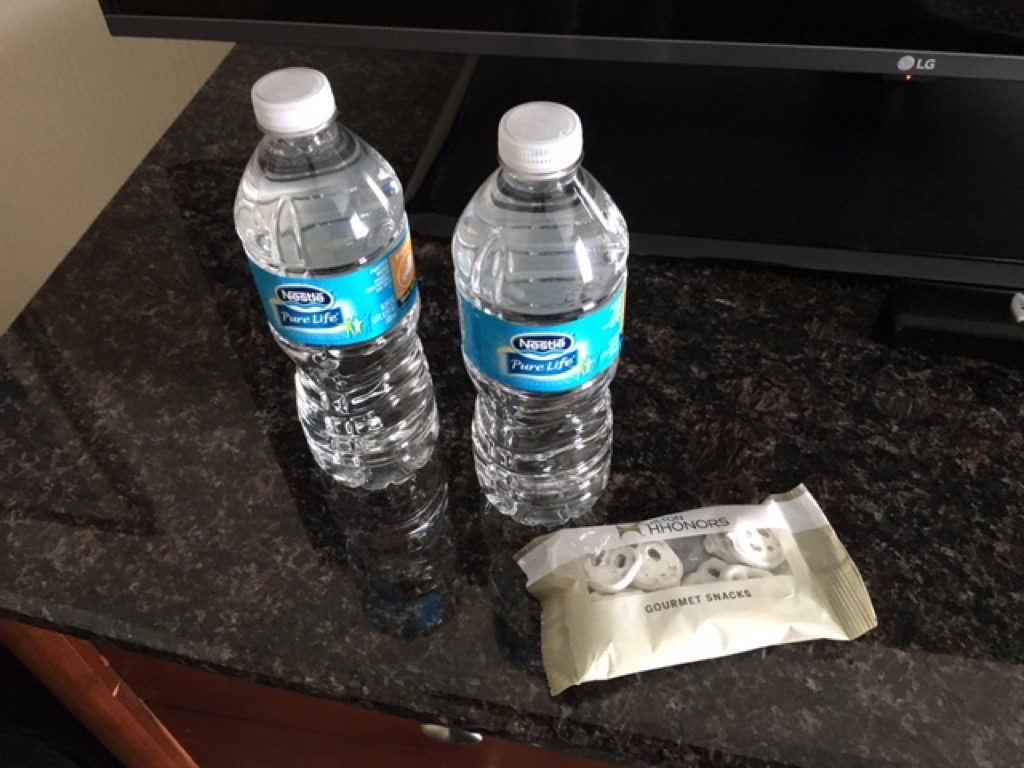 Ich bin recht früh am Morgen im Hotel angekommen und konnte auch direkt einchecken. Wie gebucht erhielt ich den Twin Bed Guestroom, allerdings hat dieses Hotel auch keine nennenswert bessere Zimmer. Ich war sehr glücklich darüber, dass der sehr frühe Check In möglich war. Aufgrund meines HHonors Diamond Status erhielt ich je einen Voucher für das Internet als auch für das Frühstück. Mir wurde auch angeboten schon bei meiner Ankunft zu frühstücken, dies lehnte ich allerdings aus Zeitmangel ab.Mit meiner Zimmerkarte wurde mir auch eine Tüte mit zwei Wasserfalschen und einem Snack in Form von Brezeln überreicht.
