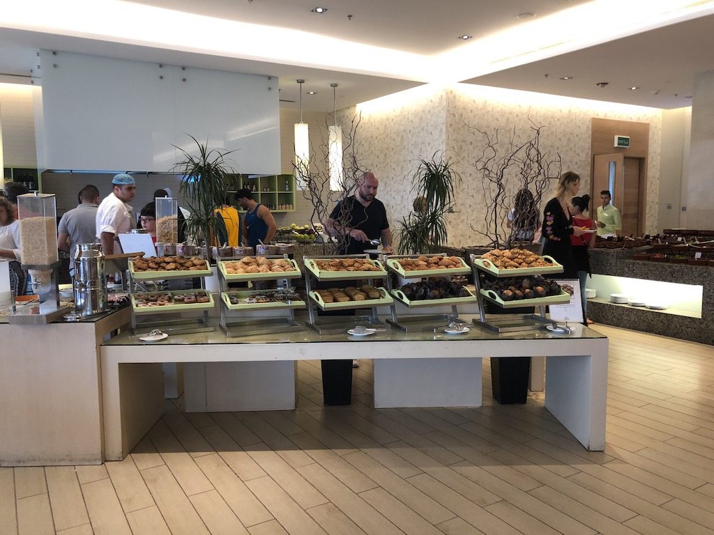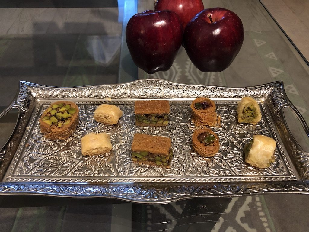 Die Lounge war ein absoluter Mehrwert, da wie bereits erwähnt die Getränkepreise im restlichen Hotel einfach in keinem Verhältnis standen. Als Häppchen gab es arabisches Brot, Hummus, Sandwiches und Kuchen.