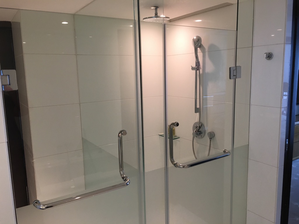 Direkt an das Schlafzimmer angeschlossen war das Badezimmer. Neben einer Badewanne gab es hier auch eine begehbare Regenwalddusche und eine mit Glas abgegrenzte Toilette.