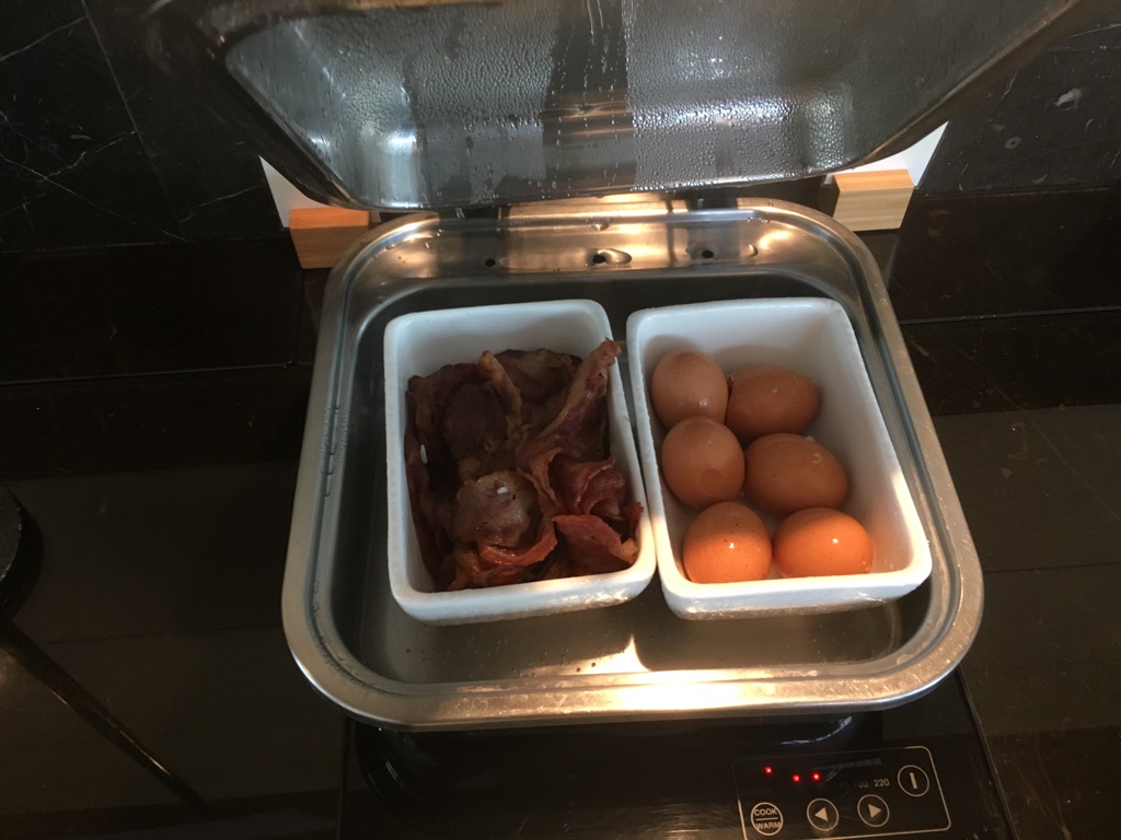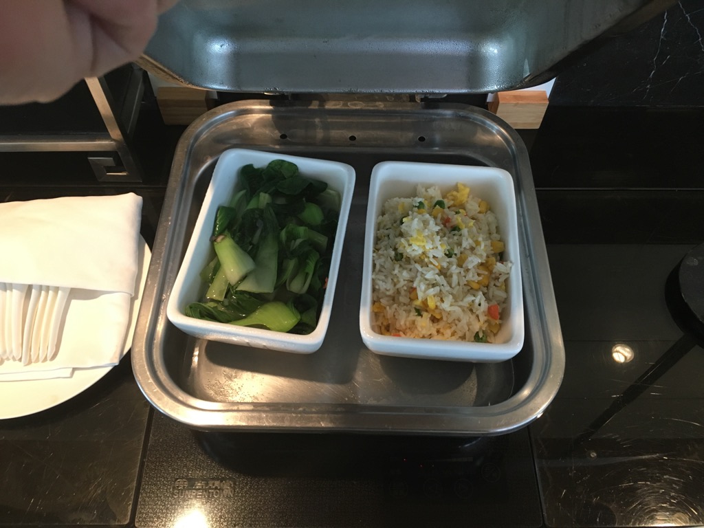 An warmen Speisen standen neben chinesischen Optionen auch Eier, Würstchen, Speck und Hashbrowns auf dem Buffet.
