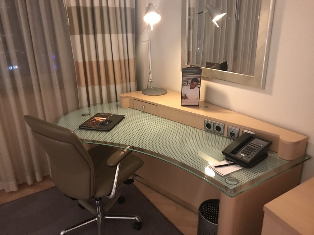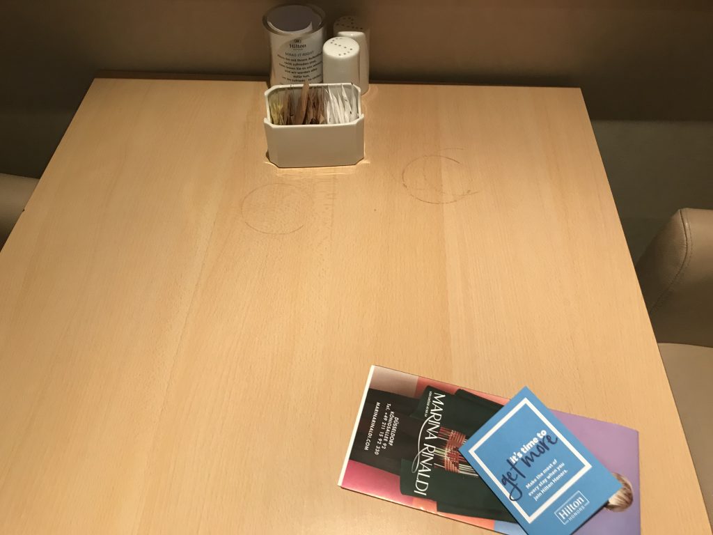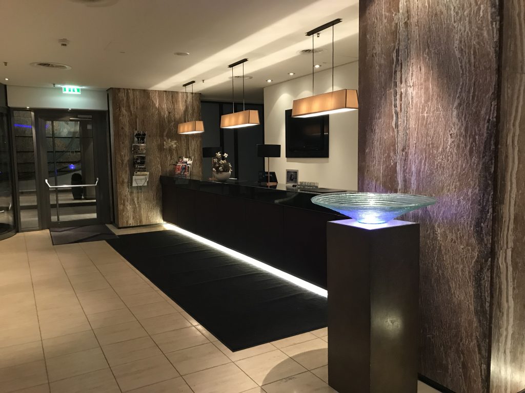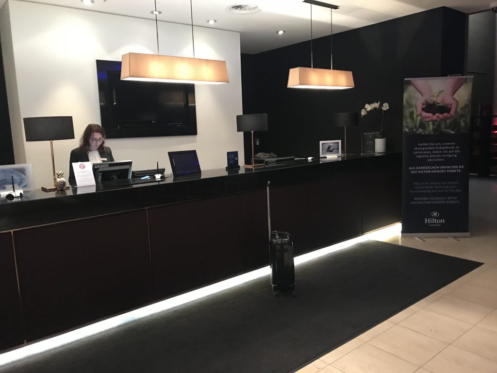 In der Lobby angekommen, wurde ich an der Rezeption sehr freundlich empfangen. Man bedankte sich für die Treue und wies auf die Vorteile des Hilton Diamond Status hin. So bekam ich ein Upgrade auf den Executive Floor und natürlich Zugang zur Lounge, sowieso kostenfreies Wlan und Frühstück. Das Frühstück konnte ich leider nicht mehr genießen, weil mein Flug, wie eingangs erwähnt, schon um 5:50 Uhr startete. Nach einer Unterschrift bekam ich die Zimmerkarte und mir wurden die Wege zum Zimmer und zur Lounge erklärt.
