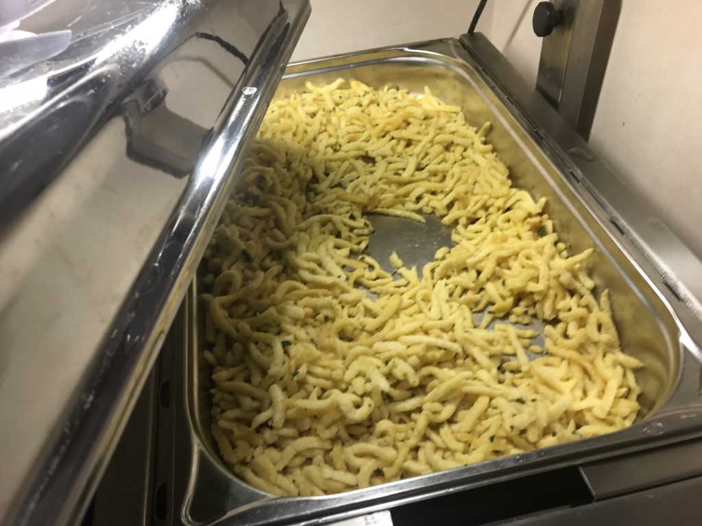 Es neben einigen kalten Canapés, Gemüse, Obst, Brot und Brötchen auch noch warmes Hähnchen, Kartoffeln und Spätzle.