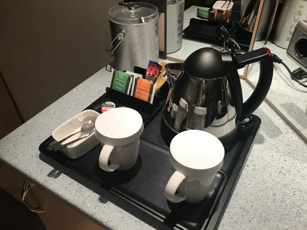 Mein Zimmer befand sich auf dem Executive Floor, relativ am Ende eines Flures. Nach dem Betreten befand sich rechts der Schrank, in dem Safe, Bademäntel und der Fön untergebracht waren. Nach dem Schrank war in einem kleinen Schränkchen die gefüllte Minibar verbaut. Auf der Minibar befand sich die Tee- und Kaffeestation.