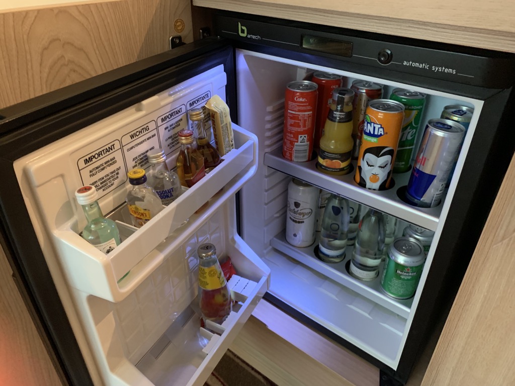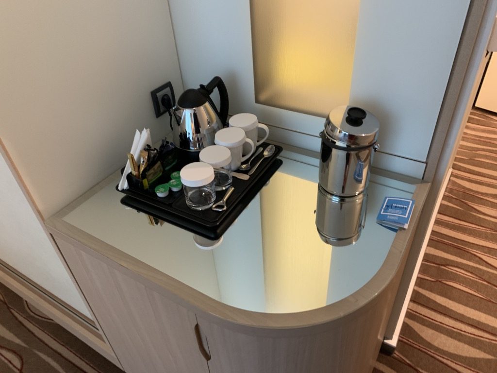 Neben dem Schrank gabes auch die gut bestückte Minibar und einen Wasserkocher samt Kaffee und Tee.
