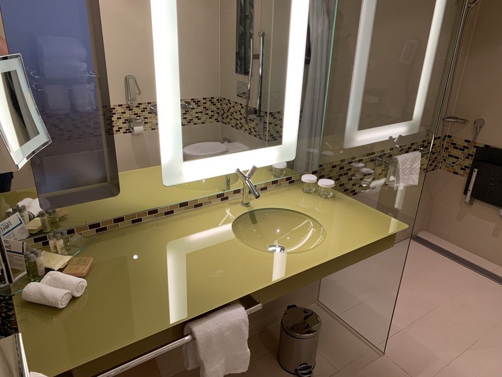 Bei meinem Zimmer handelte es sich um ein behindertengerechtes Executive Zimmer, entsprechend waren hier einige Dinge besonders im Bad ein wenig anders gestaltet. Das Zimmer selbst entsprach allerdings den normalen Zimmern im Hilton Frankfurt Airport.