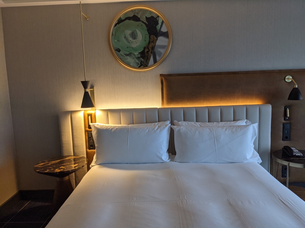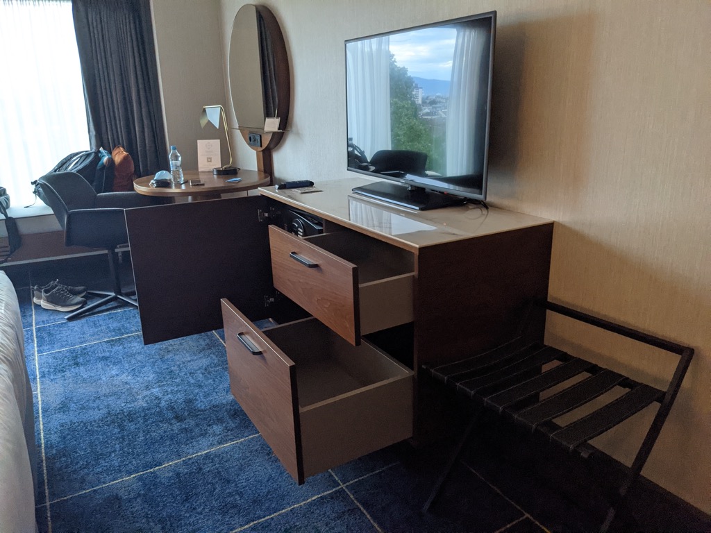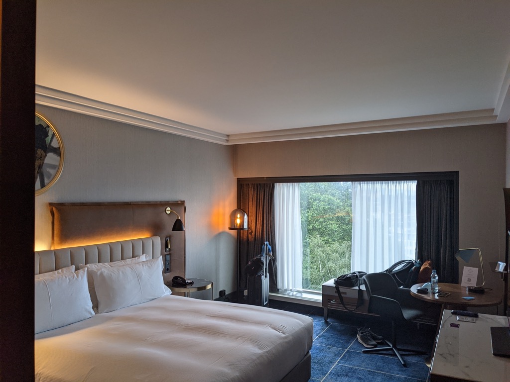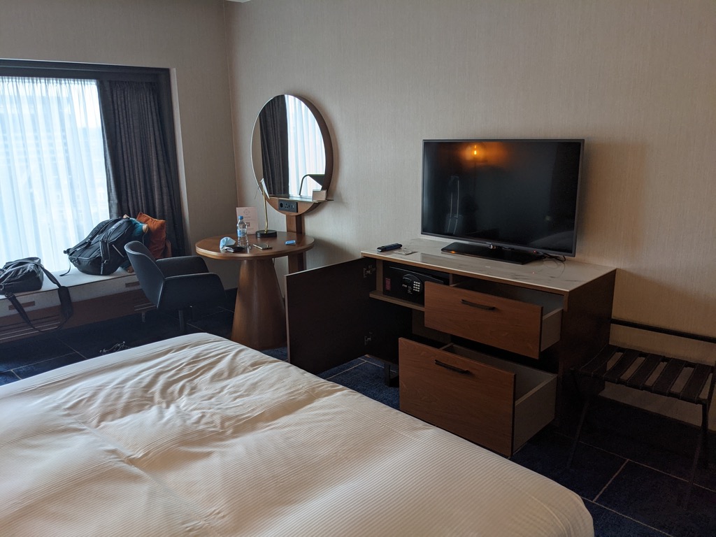 Aufgrund meines Gold Status haben wir ein Upgrade erhalten, anstelle des Queen Hilton Guest Room übernachten wir im King Deluxe Room und unser Zimmer befindet sich auf der Etage 8 von insgesamt 12 und bietet einen Park – so wie Skyline-Blick.