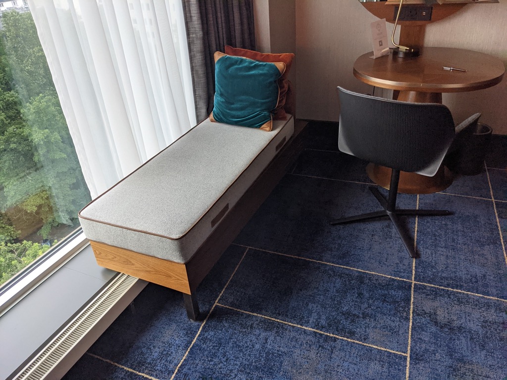 Im Schlafbereich haben wir uns über die Liege am großen Fenster erfreut.