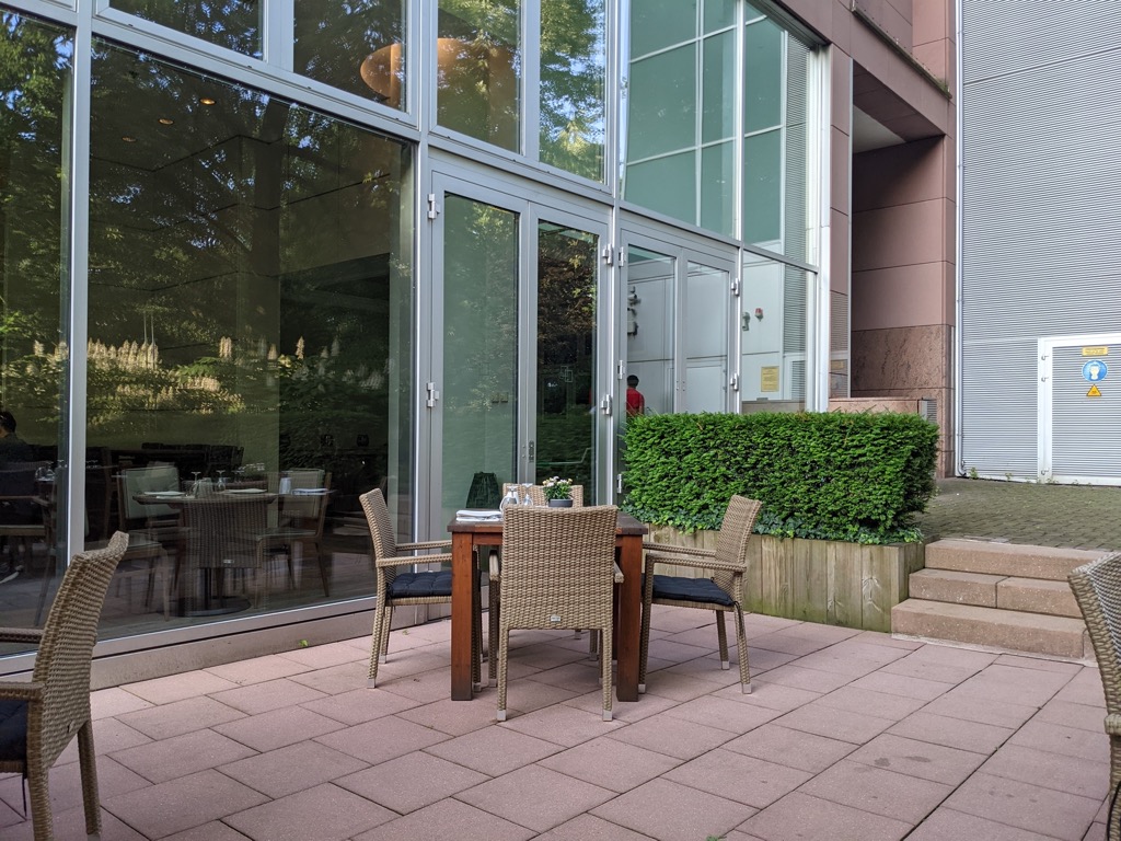 Abhängig vom Wetter gibt es die Möglichkeiten, drinnen sowie draußen zu sitzen und da wir am 2. Tag draußen sitzen konnten, können wir das empfehlen.