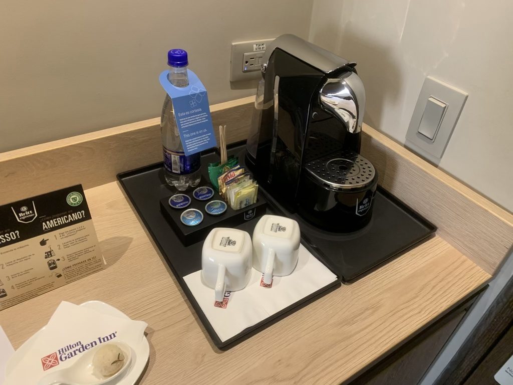 Neben der Tür befand sich ein Kühlschrank und darüber auch eine Espresso Maschine und Tee. Schön fand ich das Begrüßungsschreiben vom Hotel und auch das kleine Amenity in Form von einer Praline. Gerade in Hilton Garden Inns ist so etwas eher selten und hier ist es ganz klar die Geste, die zählt