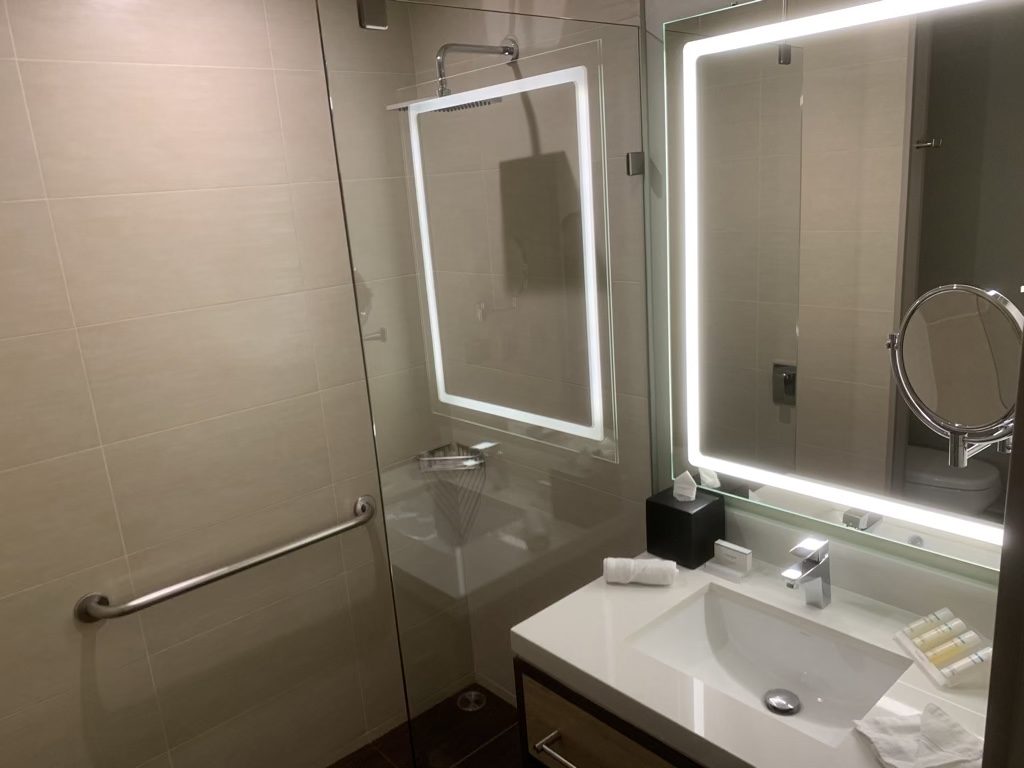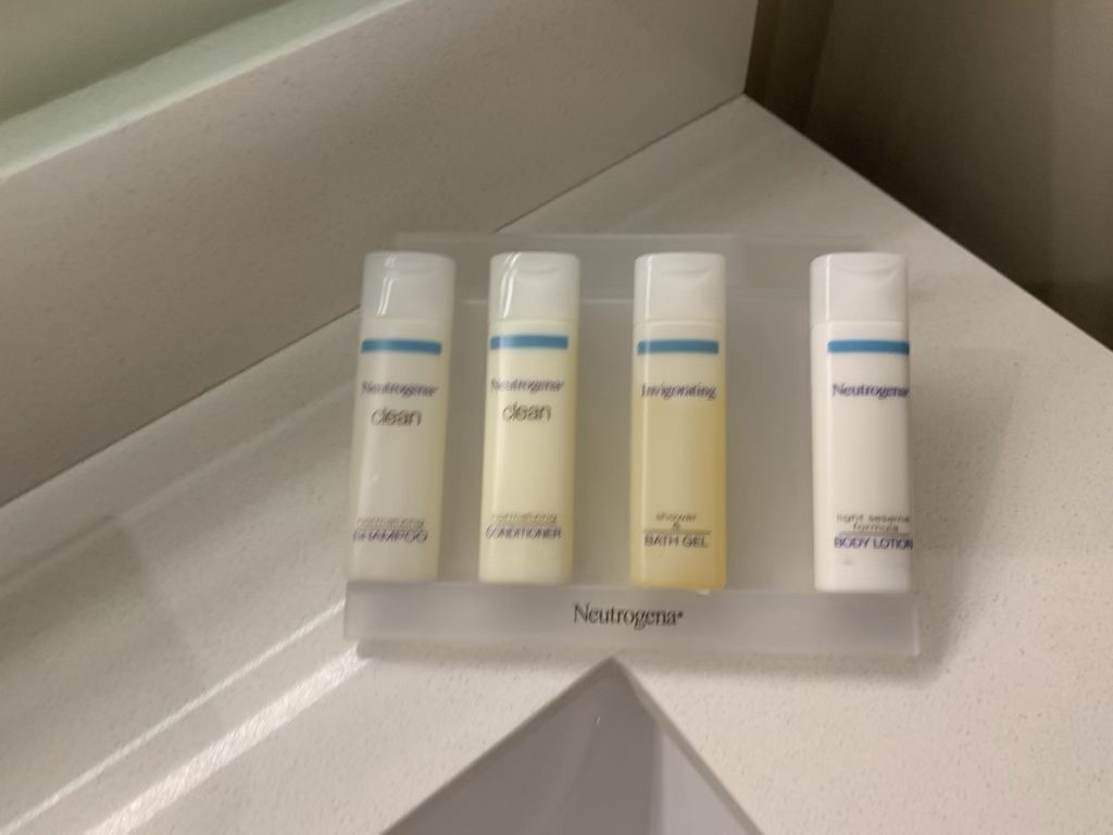 Das Badezimmer war sehr überschaubar und auf den etwa vier Quadratmetern fand gerade ein Waschbecken, die Toilette und eine Dusche Platz. Hier gab es auch die üblichen Hilton Garden Inn Utensilien von Neutrogena.