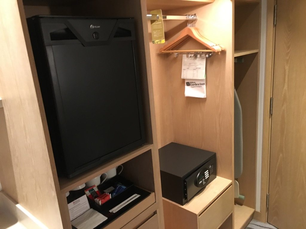 Neben dem Fernseher befand sich noch ein leerer Kühlschrank, der Kleiderschrank inkl. Safe und eine Kaffee- und Teestation. Auf der Ablage stand bereits ein Stück Kuchen für uns bereit, was entweder dem Hilton Honors Diamond Status geschuldet war oder den Flitterwochen.