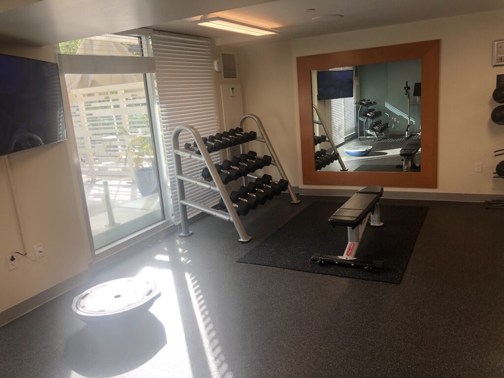 Auf der gleichen Ebene ist ein Fitnessstudio welches in zwei separate Räume aufgeteilt wurde.