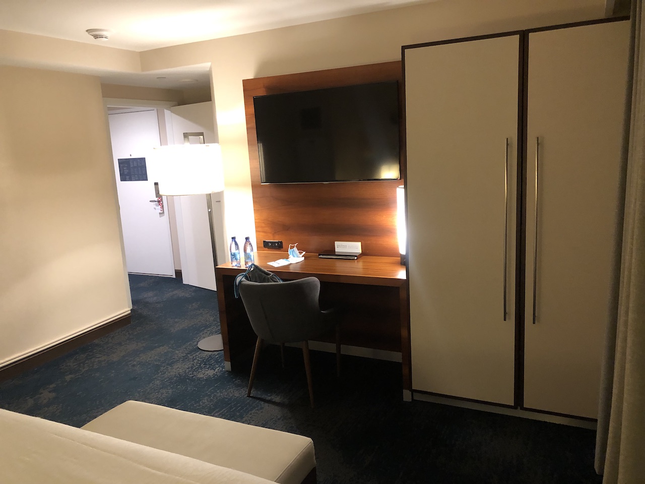 Man gelangt vom Flur zunächst in das Schlafzimmer mit eigenem Balkon, Schreibtisch, TV, Schrank und Ablageflächen. Ein weiterer Schrank war im Flur, dort konnten wir auch das Gepäck abstellen. Mitten in der Suite ist das etwas kleinere Badezimmer.
