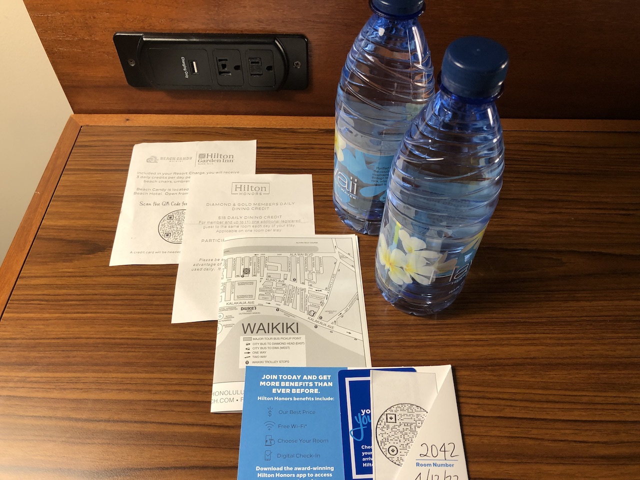 Wir erhielten ein ganzes Paket mit Informationen, u.a. zu einem Partnerhotel am Strand. Dort können sich Gäste Dinge wie Liegen oder Sonnenschirme besorgen und am Waikiki Beach nutzen. Zusätzlich gab es die Informationen über die Benefits und zwei Flaschen Wasser.