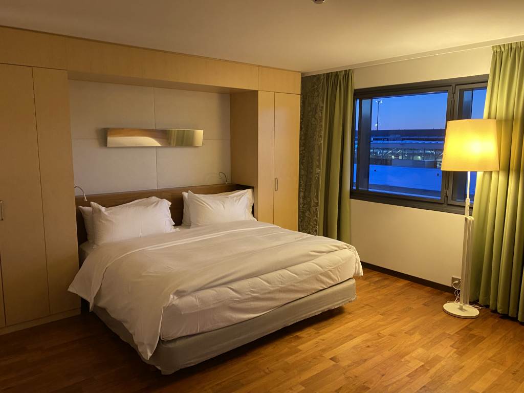 Betritt man den zentralen Wohn- und Schlafbereich, blickt man auf die Fensterfront Richtung Flughafen. An der rechten Seite der Wand hängt der LED-TV und darunter steht eine einfache Stuhl-Sitz-Kombination. Das Bett befindet sich links und wird von einer Schrank-Kombination eingerahmt, so dass jeder Gast auf seiner Seite des Bettes einen eigenen Schrank und auch eine Aussparung (als Nachttischkonsole) mit Stromanschluss und Beleuchtung für sich hat. Auf der linken Seite des Bettes befindet sich im Schrank außerdem die Minibar, der Wasserkocher und ein Safe. Im Schrank stehen ebenfalls Bügelbrett und -eisen zur Verfügung. Schreibtisch und passender Stuhl befinden sich an der Wand zwischen Wohnraum und Bad.