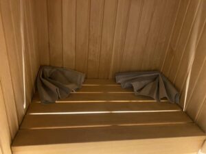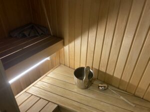 Mein persönliches Highlight 2 im Bad: Natürlich die private Sauna. Die ist zwar von der Größe her nur ein kleines Separee, betretbar durch eine Glastür, bietet aber zwei Personen (und notfalls auch zwei kleinen Kindern) platz. Wobei nur eine Person auf der oberen Ebene sitzen und in den Genuss der vollen Hitze (90 Grad Plus) kommen kann). Geregelt wird die Sauna über eine Schaltfläche im Bad. Nach einer gewissen Zeit schaltet sich der Ofen automatisch aus, so dass man sich hier keine Sorgen machen muss. Für einen Aufguss steht Eimer und Kelle bereit und aus der Sauna kann man durch ein Fenster auch einen Blick in das Zimmer werfen (so konnten wir auch die schlafenden Kinder im Blick behalten).